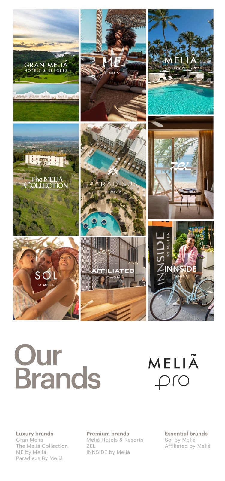 Gran Meliá Hotels & Resorts, ME by Meliá, The Meliá Collection, Paradisus by Meliá, Meliá Hotels & Resorts, ZEL, INNSiDE by Meliá, Sol by Meliá and Affiliated by Meliá.